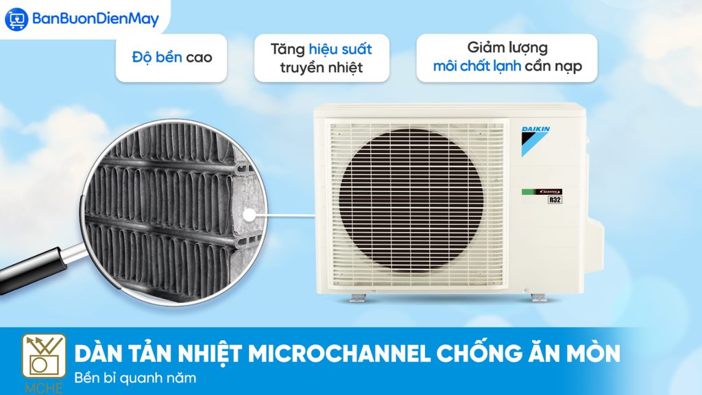 Khả năng chống ăn mòn là ưu điểm không thể bỏ qua trên Daikin FTKY50ZVMV nhờ dàn tản nhiệt Microchannel cấu tạo từ hợp kim nhôm và các vi ống song song. Thiết kế này không chỉ tăng hiệu quả trao đổi nhiệt mà còn giúp máy chống chịu tốt hơn với môi trường ẩm ướt, hơi muối, lý tưởng cho cả khu vực ven biển hay vùng có khí hậu khắc nghiệt.