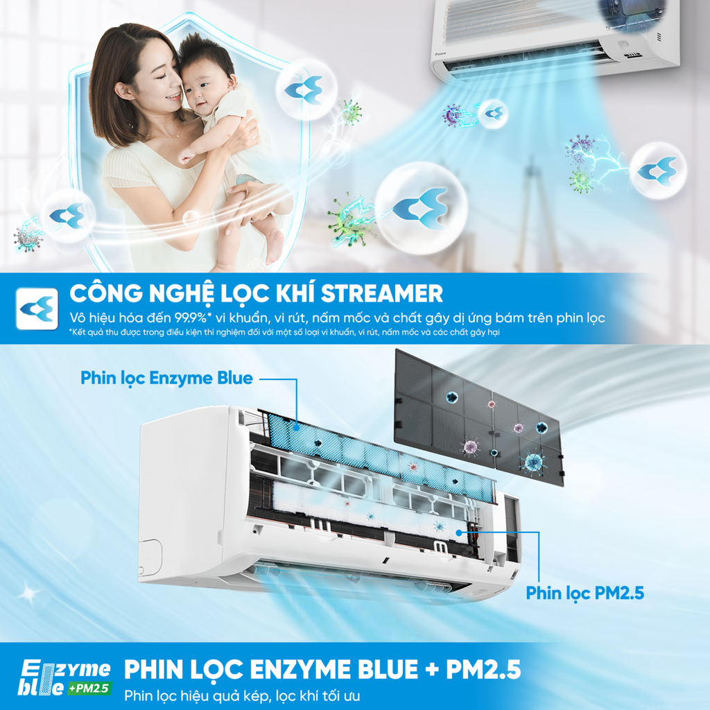 Không chỉ làm mát, điều hoà Inverter Daikin FTKY50ZVMV còn là "lá chắn" bảo vệ sức khỏe nhờ bộ lọc Enzyme Blue và tấm lọc bụi mịn PM2.5. Có khả năng loại bỏ vi khuẩn, vi rút, nấm mốc, tác nhân gây dị ứng và mùi khó chịu. Đặc biệt, công nghệ Streamer tiên tiến tạo ra các dòng plasma điện tử giúp phá vỡ cấu trúc của vi khuẩn, virus và bụi mịn trong không khí, đồng thời làm sạch dàn lạnh khi máy ngưng hoạt động, đảm bảo không khí trong phòng luôn tinh khiết như vừa được "làm mới".