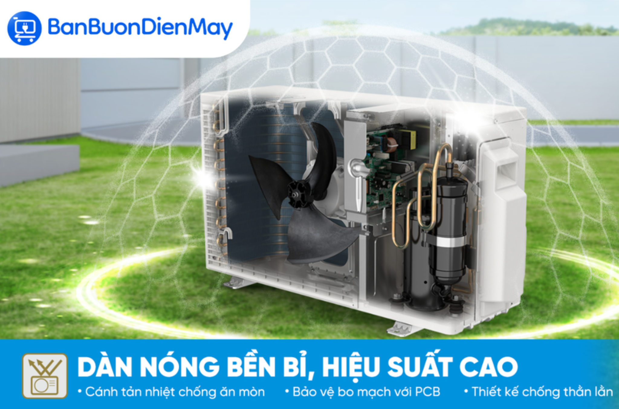 Model này được phủ lớp chống ăn mòn đặc biệt trên dàn tản nhiệt, giúp hạn chế tác động của mưa axit, hơi muối (với khu vực ven biển) và độ ẩm cao. Điều này đặc biệt quan trọng tại Việt Nam nơi khí hậu nóng ẩm quanh năm. Lớp bảo vệ giúp giảm nguy cơ oxy hóa, hạn chế rò rỉ gas do ăn mòn, tăng tuổi thọ máy.