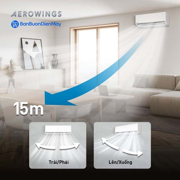 Công nghệ AEROWINGS với hai cánh đảo gió độc lập giúp điều hướng luồng khí mát chính xác và xa hơn lên đến 15m. Cánh phụ nén khí mát tập trung, trong khi cánh chính mở rộng phân phối đều khắp không gian, giúp làm mát nhanh và dễ chịu hơn.