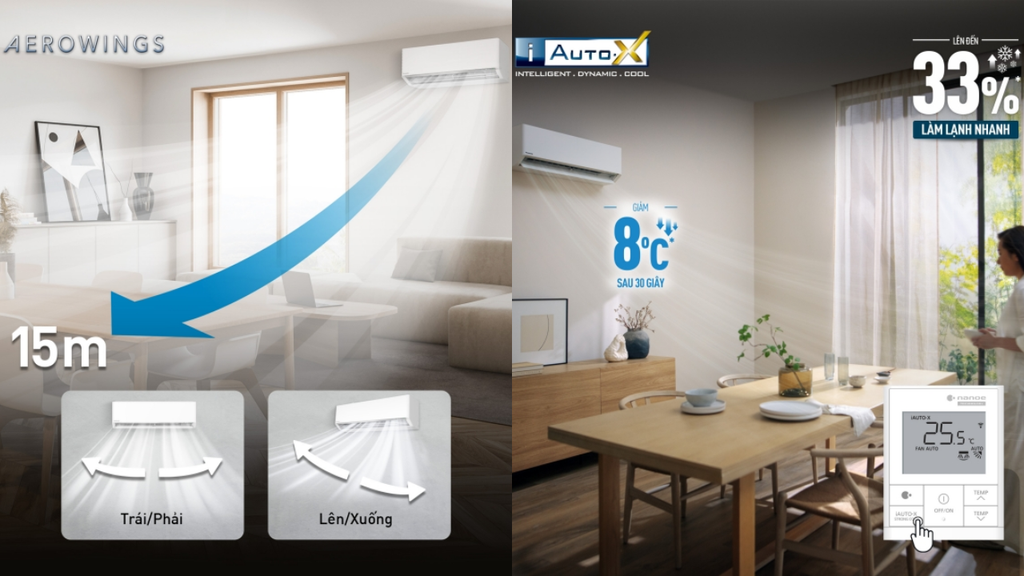 - iAUTO-X: Cho khả năng làm mát nhanh hơn 33%, hạ ngay 8°C chỉ trong 30 giây nhờ công nghệ P-TECh tăng cường công suất máy nén. Đây là lựa chọn hoàn hảo cho những lúc phòng đông người hoặc nhiệt độ ngoài trời tăng cao đột ngột.