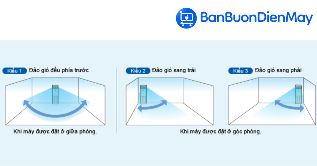 Máy hỗ trợ 3 kiểu đảo gió tự động, kết hợp với khả năng đảo gió lên xuống độc lập giúp: